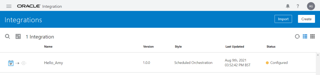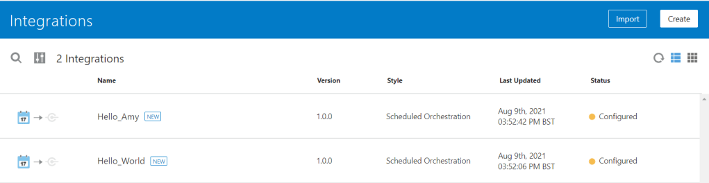 Now, as you can see in the below screenshot, my integration is now available within the OIC service console again. (Both integrations remain in “CONFIGURED” status.