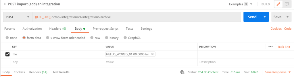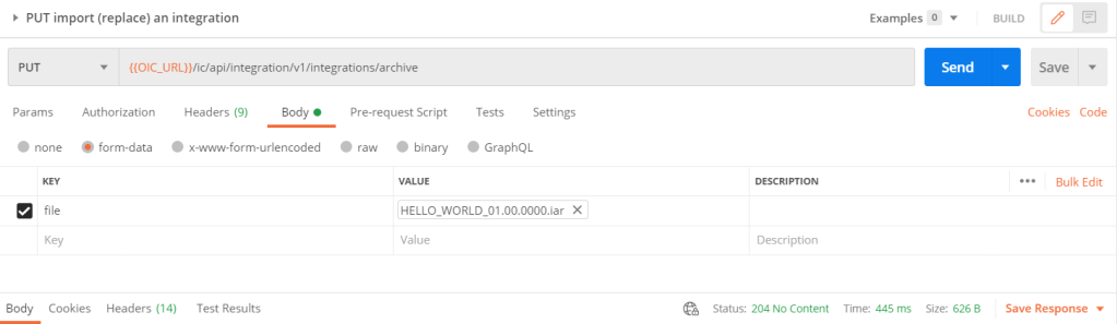 This endpoint imports a new integration that was previously exported. To submit this import (add) request, the integration must not be present in the OIC instance. If the integration was imported before, we can use the import (replace) request – details later in this post.