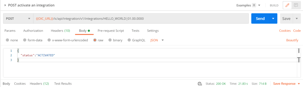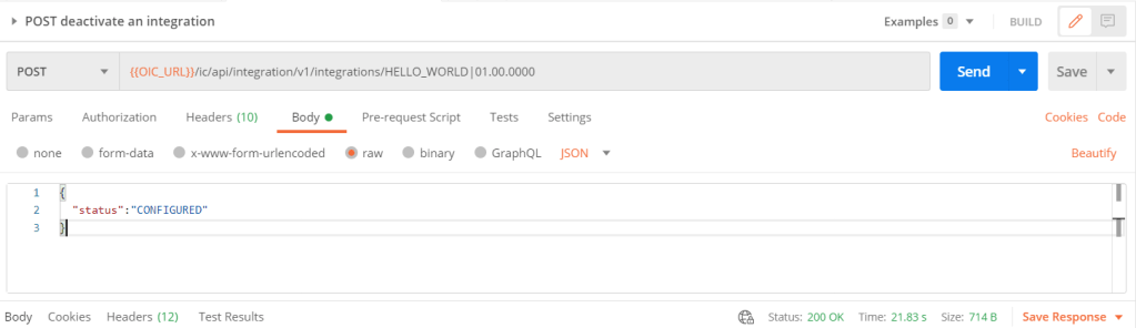 - Endpoint: <<OICServiceURL>>/ic/api/integration/v1/integrations/<<integrationID>>