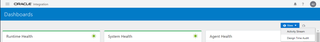 Oracle Integration provides a high-level dashboard containing information and tools helping to monitor and manage integrations in the runtime environment. The dashboard can be used to see how your integrations are performing and gives access to various view to check how your services are running. You can see a quick view into performance metrics for any integrations that are currently activated in your environment. The dashboard also provides a view of recent activity for running integrations and the ability to download all activities.