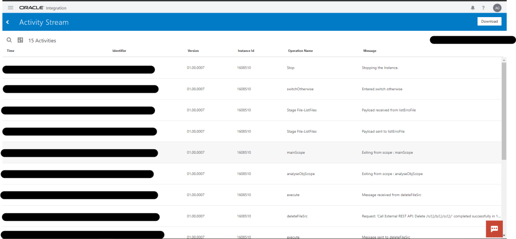 Within the Oracle Integration dashboard, you can also view the integration activity streams. If you are familiar with Oracle Integration, you will know that each integration will produce and activity audit with message activity for any invoked/running/completed integrations. It provides information about the status of a message, activity or transaction and contains the payload throughout runtime of an integration. (if you are not familiar.. maybe I will cover that in a later post?).