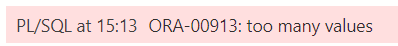 Again, you will notice that this error message looks a little different to the others we have seen for the same reason as we saw with the TOO_MANY_VALUES error – the PL/SQL block above is actually invalid and failed to compile, hence ORA-06550. However, you can also see the “real” reason for failure, ORA-00913: TOO_MANY_VALUES. Note – this is an error message you might also come across when inserting data into a table.