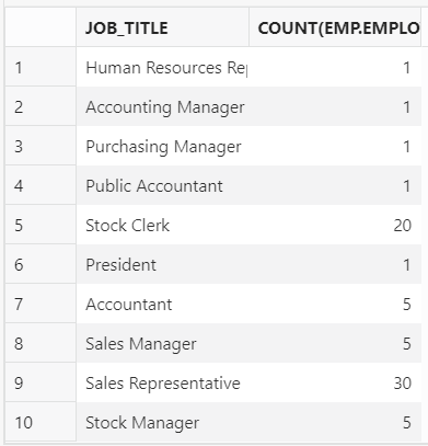 Whilst the above example helps to ascertain which jobs that I have employees assigned to, it is not overly useful. Perhaps it would be better to understand how many employees I have assigned to each job type – to do so, I must use an aggregate function (COUNT()):