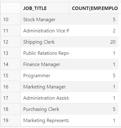 job_id. The query returned 19 results – note, my database table contains 107 employee records (none of these records have aNULLvalue in thejob_idcolumn)