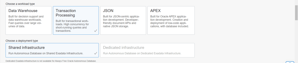 Step 6: Choose a workload and deployment type. As we want to create an ATP service, I have selected the “Transaction Processing” workload type and “Shared Infrastructure” as deployment type. As I am using an “Always Free” autonomous database, it is not possible to select “Dedicated Infrastructure”