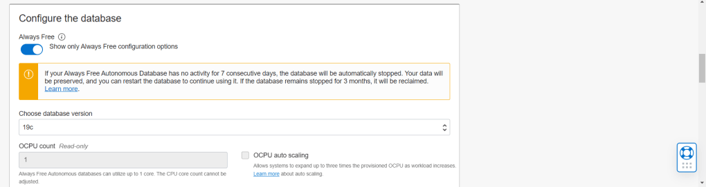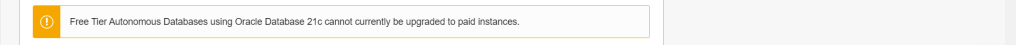 If I chose to select database version 21c, at the time of writing this post, I would be presented with a warning message as below. So, if you do plan to later upgrade this service to a paid instance then you’ll need to go with version 19c.