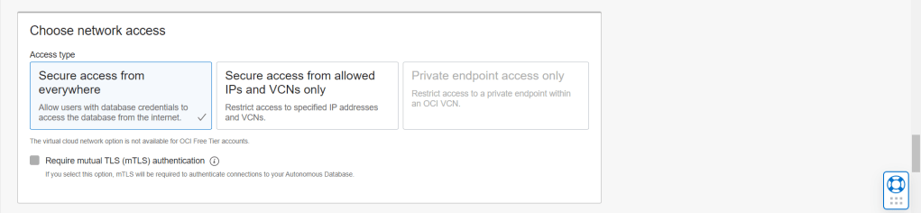 Step 9: Select choice of network access rules. Here I have retained the default selection to secure access from anywhere. This means that I won’t need to specify a list of IP addresses/VCNs that can access (clearly you should do this if you are trying to productionize your service 🙂 ). Instead, if you have the database credentials, access will be allowed.