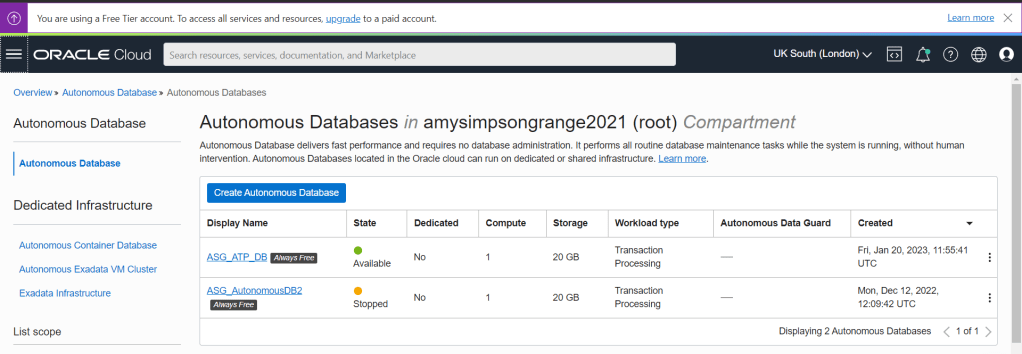Note 2 – The details below assume that you already have a provisioned & active Oracle Autonomous Database service instance. If you do not, you may wish to follow the steps in my posts: Creating an ATP Database in Oracle Cloud & Connecting to an ATP Database in Oracle Cloud