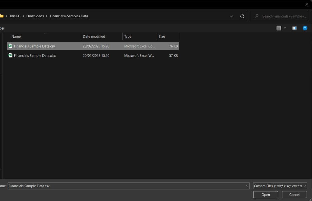 Step 4: As I chose to browse my local machine for a file to upload, I am presented with windows file explorer and have navigated to the file I wish to upload. Note – this is just a sample CSV file downloaded from here.