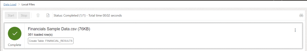 Step 6: Now you are happy with the pre-load checks, you can hit the “start” button to begin the data load. The jobs will be sent to the Autonomous Database job scheduler and run in the background.