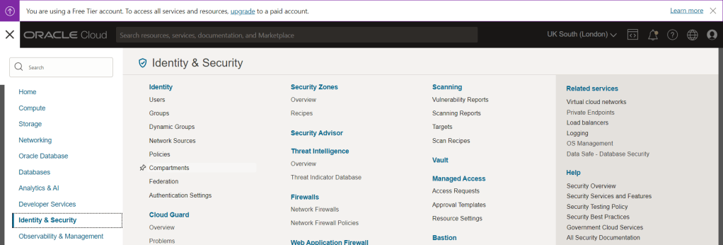 Step 3: Select “Identity & Security” and then select “Compartments”
