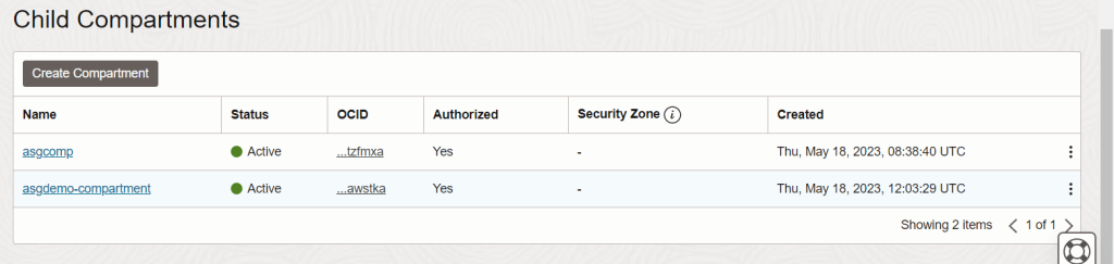 The reason for this is that I didn’t choose my root compartment as parent. If you did, you would see it here. Instead, to view my new compartment, I need to click on the compartment I chose as the parent (“ASG”). Now I can see my new compartment and it will be available for use within Oracle Cloud