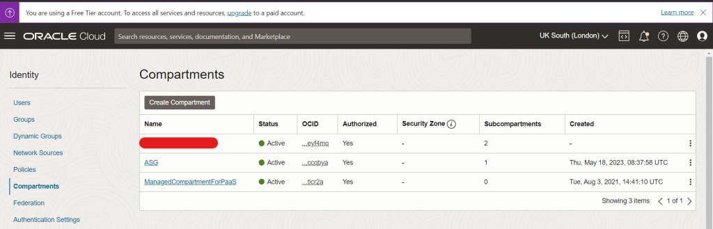 Step 4: You will be presented with the Compartment management screen. Here you can see that I already have 3 compartments provisioned (2 of these are auto-provisioned by Oracle when the tenancy was created). Click “Create Compartment”