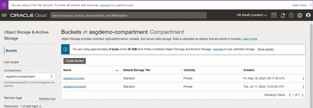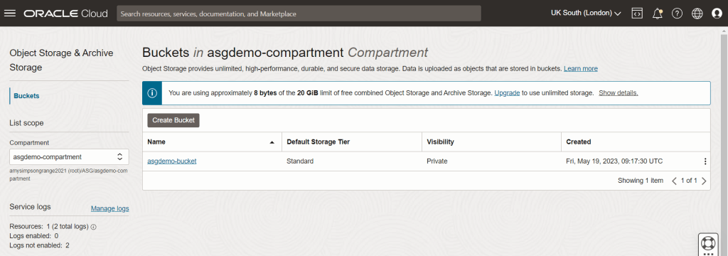 Step 10: You will be presented with the Bucket management screen. Select the compartment in which you would like to update a bucket (If you haven’t got any compartments and you don’t want to use your root compartment, take a look at my post: Creating a Compartment in Oracle Cloud).