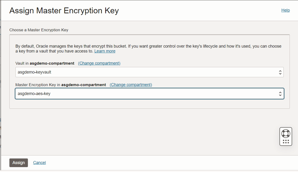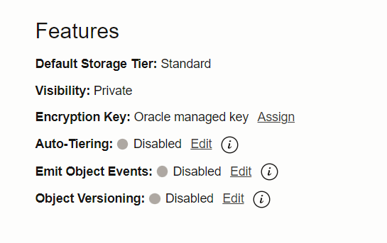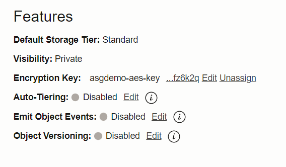 Step 11: You will be presented with the bucket details screen. Here you will be able to view the objects stored within the bucket and edit the bucket. The details will list the encryption key in use – for this bucket you will see that I have an “Oracle Managed Key”. Click “Assign”