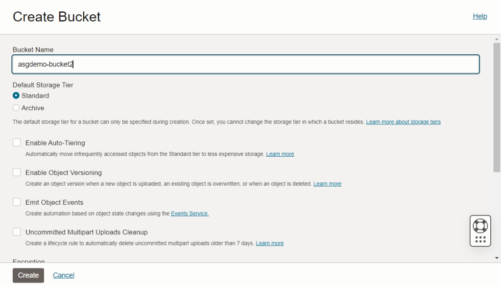 Step 8: Provide basic information for the bucket creation – make sure that you scroll down to select “Encrypt using customer-managed key”. Had we not set the policy in the previous step, we would not see the available keys in the list of values. Once done, click “Create”.