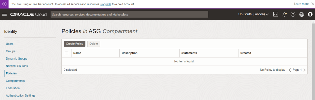 When you have selected the compartment that you want to create your policy in, click “Create Policy”