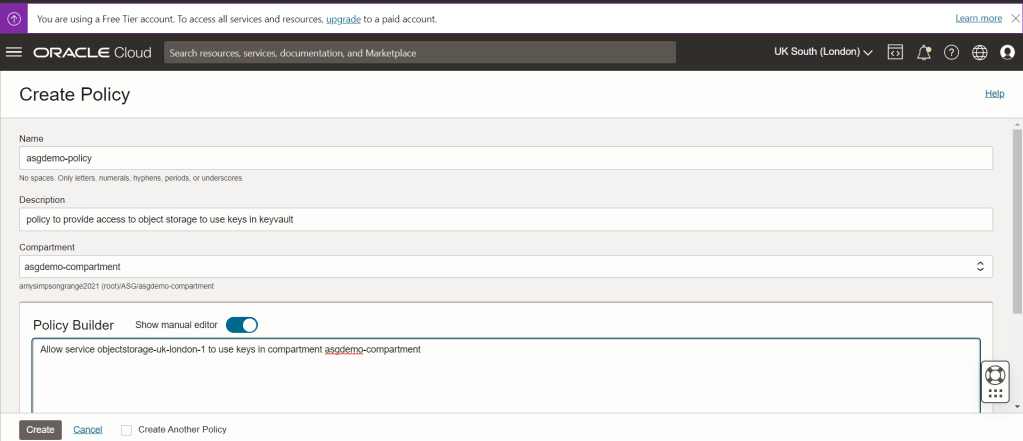 The policy added is: Allow service objectstorage-uk-london-1 to use keys in compartment asgdemo-compartment
