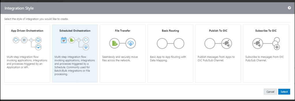 Step 5: Click Create and select integration style. As mentioned I have selected the “Scheduled Orchestration” type. Once selected click “Select”.