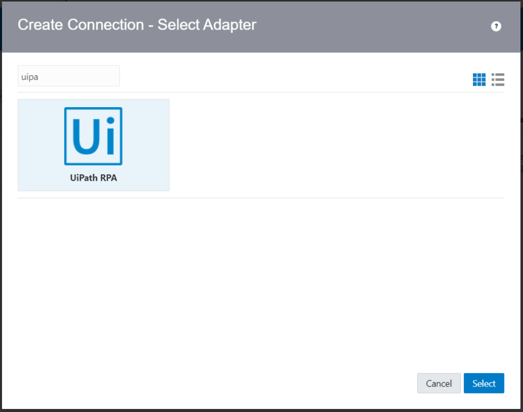 Step 6: Given we are wanted to configure an adapter to UiPath, here we need to choose UiPath and click “Select”