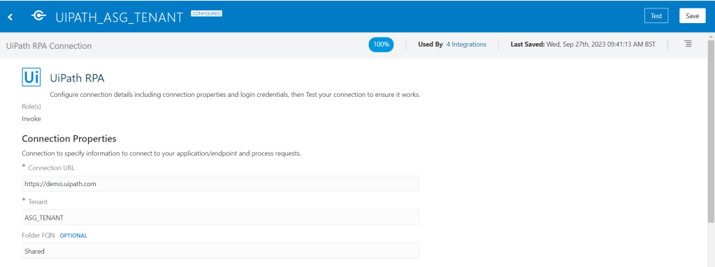 - Folder FQN: here I use “shared” as the processes I will call will be contained within the shared directory. If I do not specify a value, the default tenant value will be used (note – when testing the connection, Oracle Integration will also ensure that the folder FQN is valid)