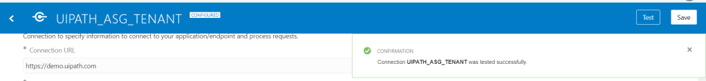 - Connection URL: This is the URL of your UiPath orchestrator instance. In this case, I will use https://demo.uipath.com but I could use https://cloud.uipath.com