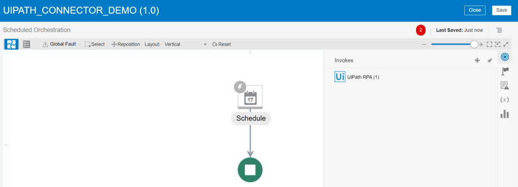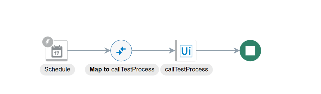 If you have successfully followed the steps documented above, you will now be able to go ahead and use the adapter in an integration. For completeness, I have documented below a very basic usage of this adapter. I will simply create a scheduled integration (for ease of illustration) and within this integration I will invoke the UiPath adapter to call a “test connectivity” process that has already been defined in UiPath. Note here, the importance of the “Trigger/Invoke” choice when setting up the connection. Without declaring that the connection can be used in an Invoke scenario, this would not be possible.