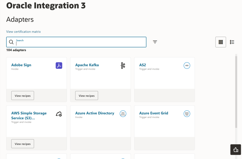 - Improved adapters page on the Oracle Help Center. This allows you to more easily find documentation specific to an adapter using the search functionality, more easily browse available adapters using useful filters (such as “popular”), view the adapters in card or list view and view the available OOTB recipes available for any such adapter.