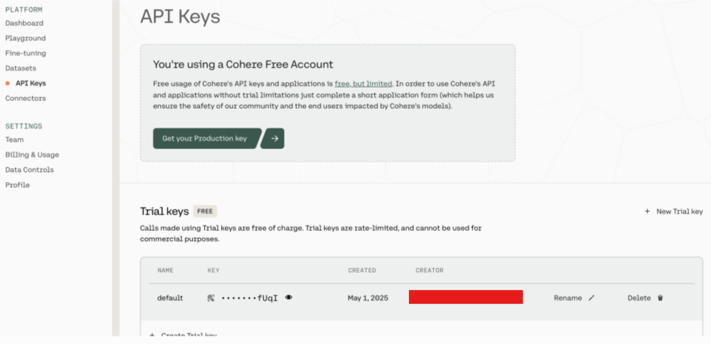 Step 2: Click on “API Keys”. You will see that you already have a “default key”. click on the eye icon to see and copy the key – Save this for later. (note – you will see I have using a Cohere free account).