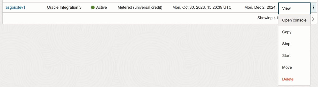 Step 4 – If you wish to change the compartment in which you are provisioning the Oracle Integration 3 instance, you can do so here before clicking the “3 dots” icon. Here you can see that I already have 2 instances already provisioned (1x Oracle Integration Gen 2 & 1x Oracle Integration 3). If you have not yet set up a compartment, see my post: Creating a Compartment in Oracle Cloud.