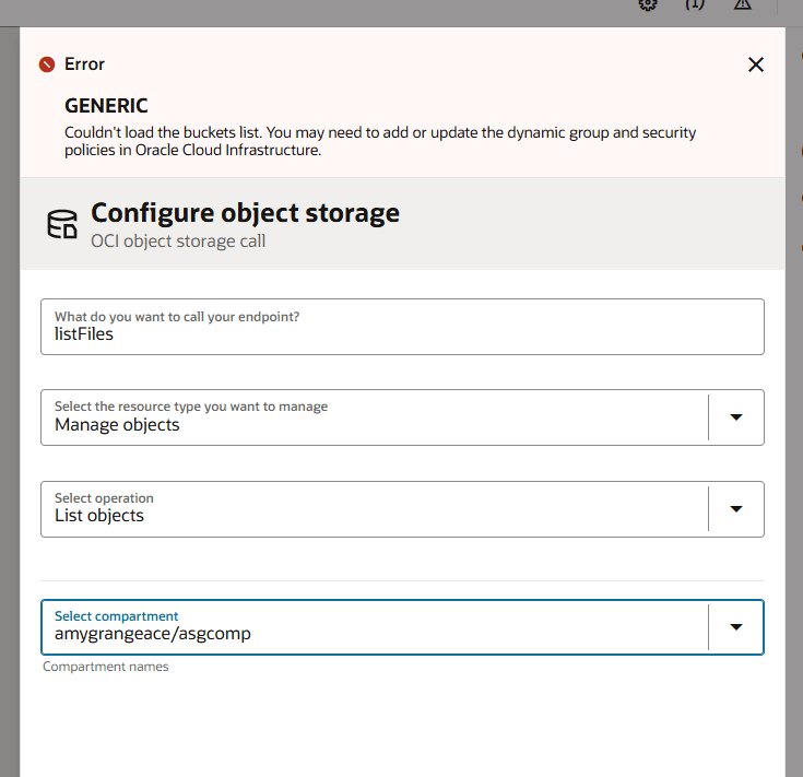 The problem is, when you begin to populate the wizard, you might come across the below issue. This error is ultimately telling you “I can’t access the OCI object storage service to allow you to select which bucket you want this action to look at!”