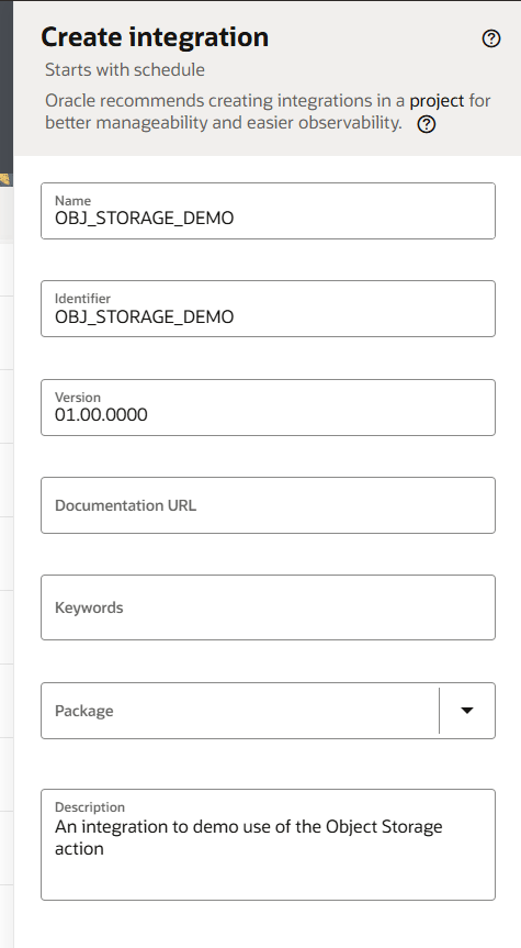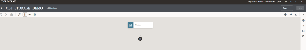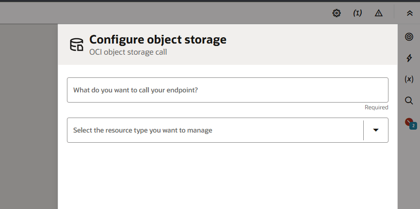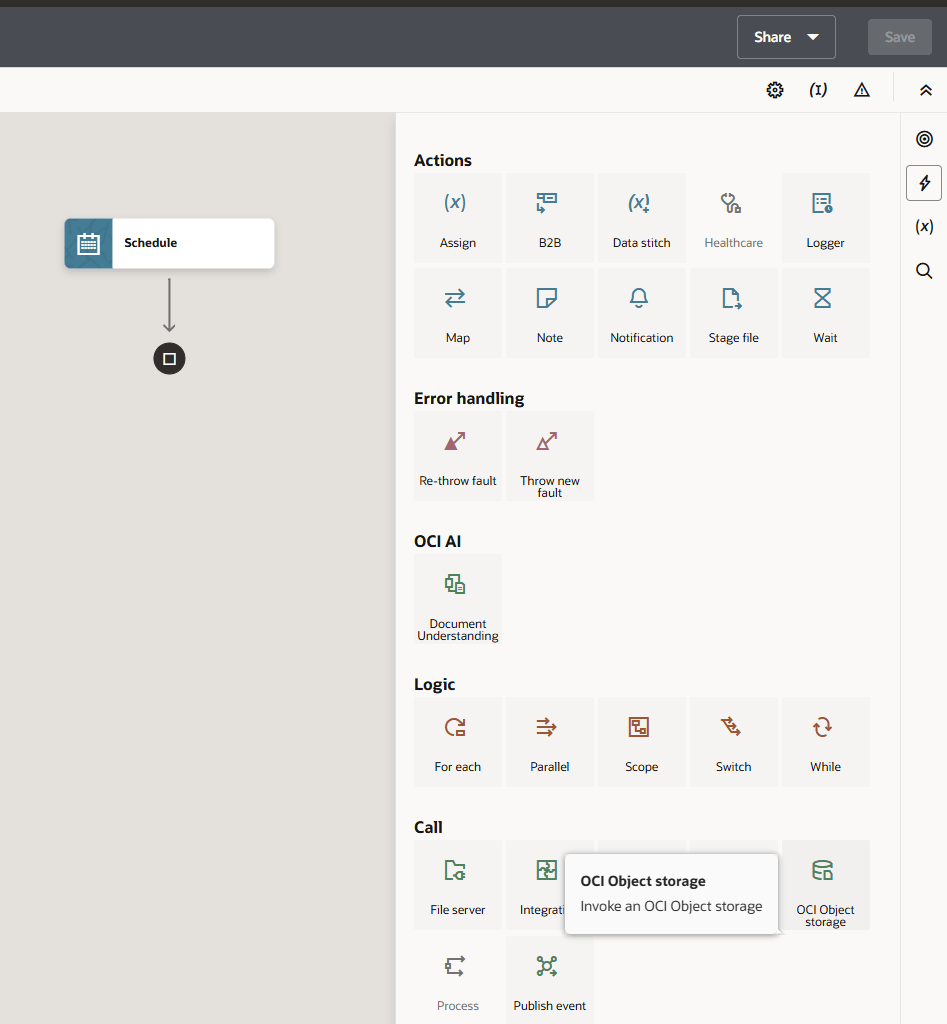 In this integration, we want to perform a really simple action: just list the available objects available in an OCI Object Storage bucket! To do that, we need “drag” an OCI object storage action onto the integration build canvas.
