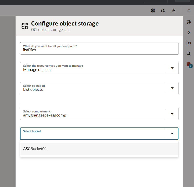 Now, when I return to the OIC instance, to reconfigure the OCI Object Storage action, you can see that the OIC instance is now able to communicate with OCI Object Storage and the list of available buckets becomes available. Here I select my bucket “ASGBucket01” and click “continue”.