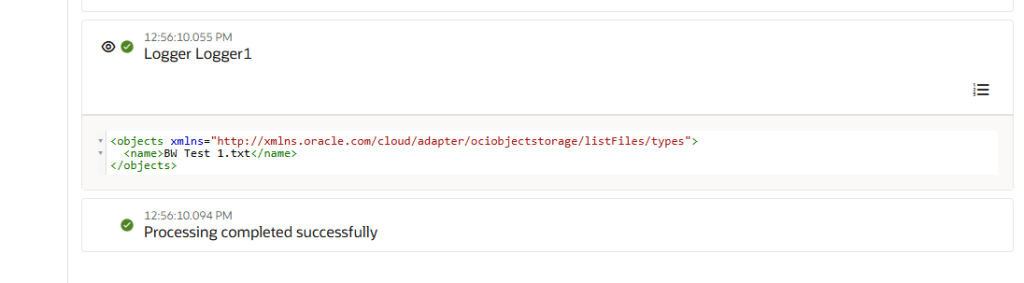 This is a really simple (and unrealistic!) integration for demonstration purposes, however, for completeness, here is what happens when I run the integration – I see the logged record of the file that exists within my OCI Object Storage bucket.