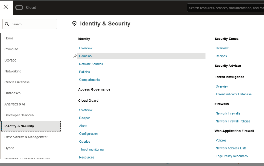 Step 2 – Click the menu icon (often referred to as the “hamburger” or “pancake stack”). Then Select “Identity & Security” before selecting “Domains”.