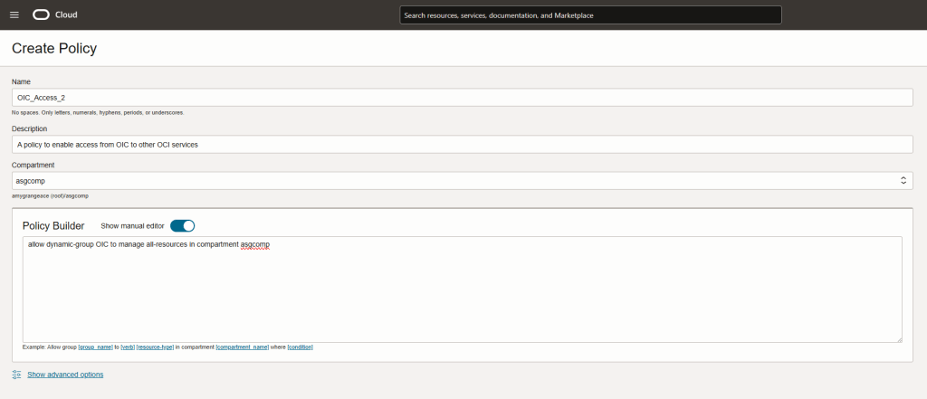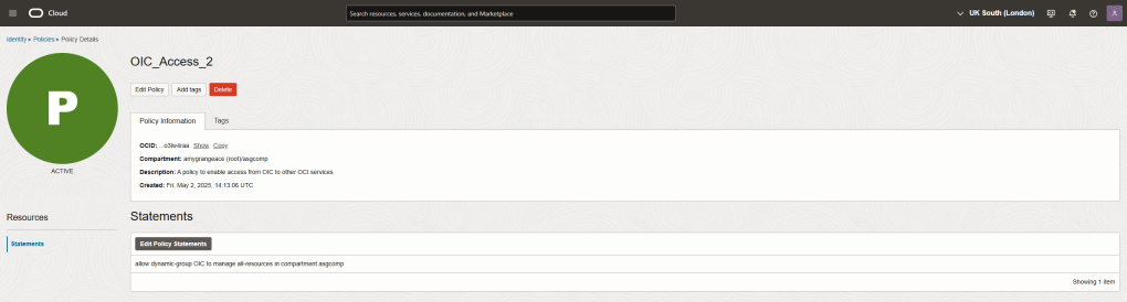As I’ve said previously, this is just an example (a wide reaching one!) it allows OIC to “manage” all resources within the compartment. you may wish to be more specific than this.