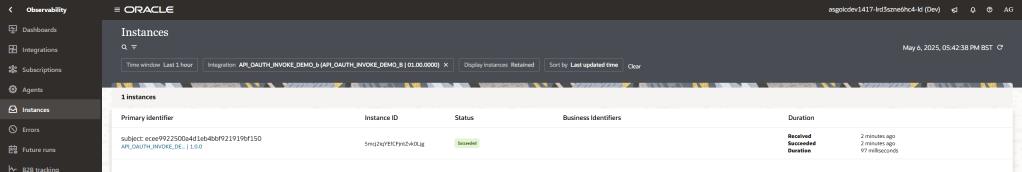 The final check to do is to confirm that my integration triggered in the OIC console. When I checked… SUCCESS.