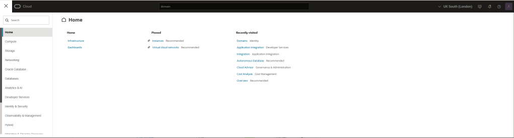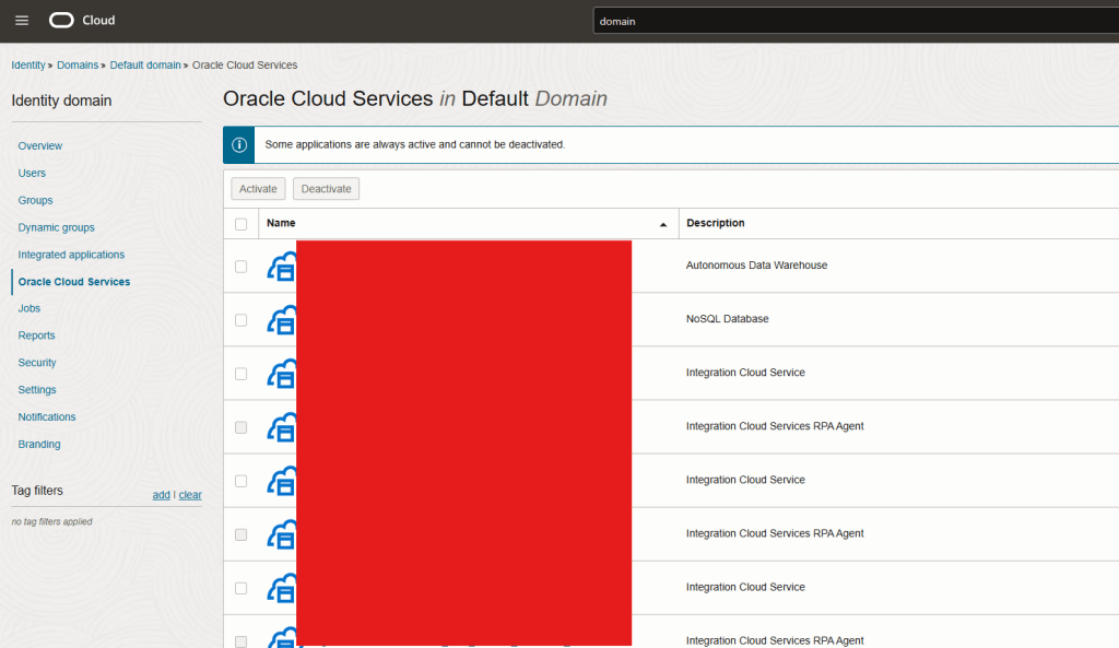 Navigate back to your domain and click on “Oracle Cloud Services” and click on your OIC instance application.