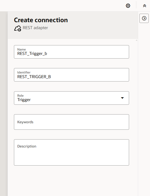 Step 12 – To do that, we need to add a connection onto the integration build canvas. Open the right-side panel with the “>” icon. In true blue peter style ( 🙂 ), I already have a REST trigger connection, though, for demonstration purposes, I’ll create another.