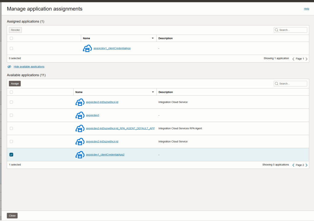 You will need to assign your confidential application to your OIC instance application. To do so, click “Manage” next to “Assigned applications”.