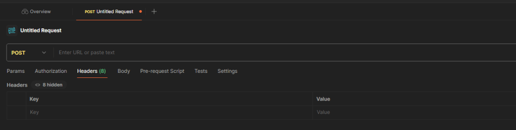 Step 1 – Open Postman. click the “+” icon next to the “overview” tab. This will create an “Untitled Request” tab.