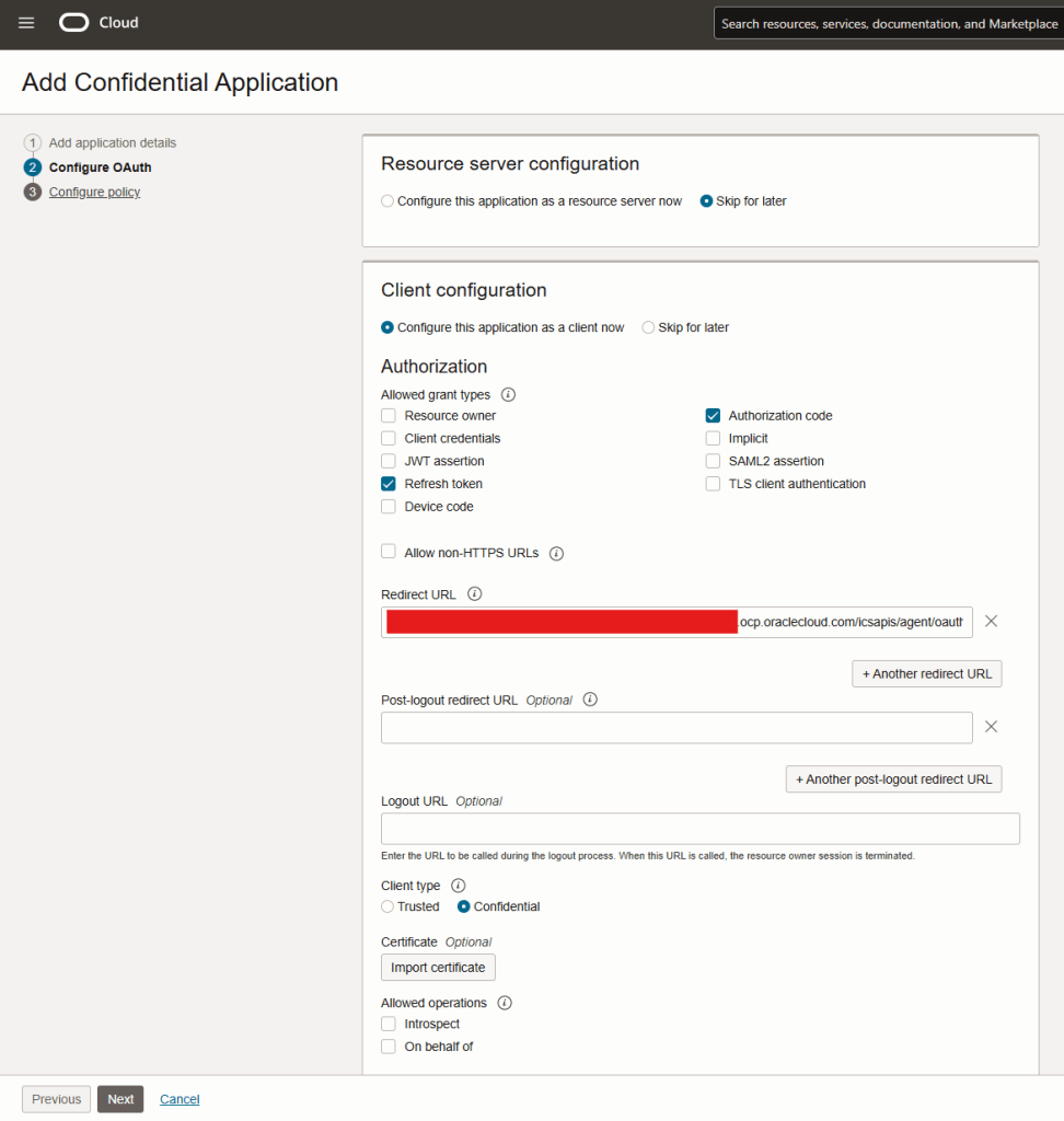 - Redirect URL: https://<oic_url>/icsapis/agent/oauth/callback