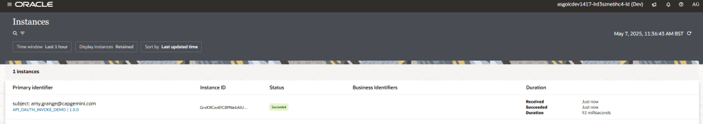 The final check to do is to confirm that my integration triggered in the OIC console. When I checked… SUCCESS. Notice that the security subject I used as the integration’s business identifier in this flow is my user credentials.