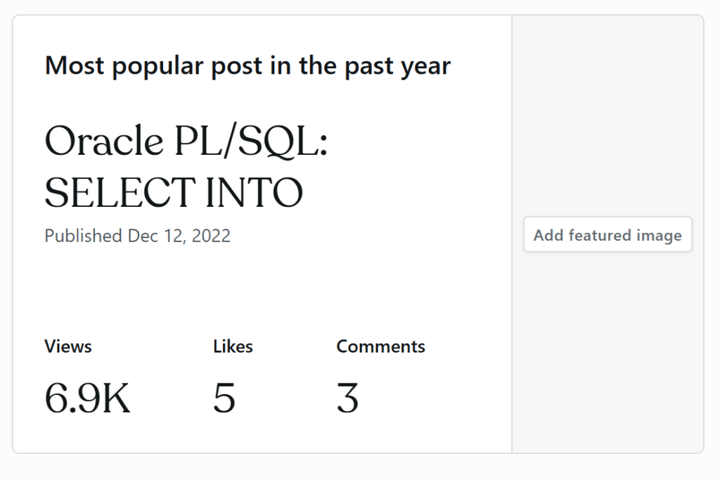 Interestingly, in the last year (and actually before that too if you look into the stats!), my post Oracle PL/SQL: SELECT INTO is the most popular – you can’t beat the old favourites. To be honest – there is reflection in this itself. Years ago, I was told “PAH – We won’t have access to the Oracle DB in a SaaS world so we don’t need SQL/PLSQL skills anymore”. How wrong that viewpoint is – the stats speak for themselves!