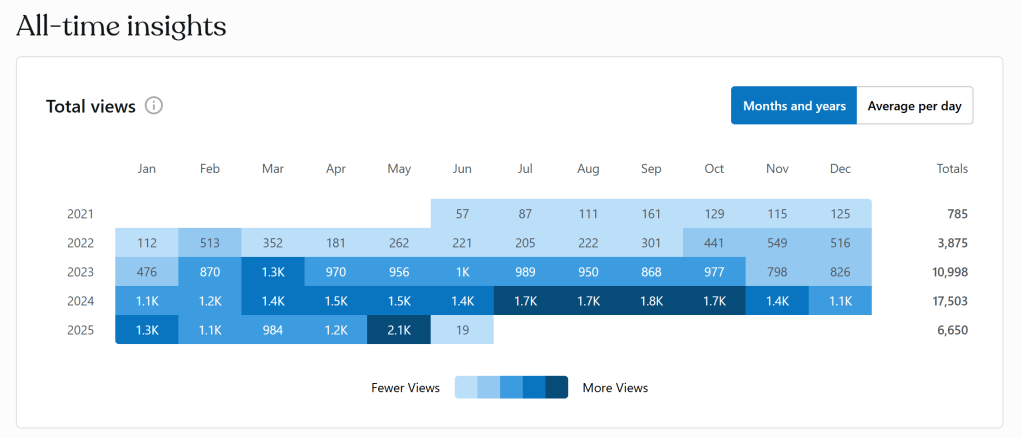 Whilst I’m here – for those of you thinking about starting to share knowledge via blogs, there is no way in 2021, I thought that I would be pulling in 17.5k views annually by the end of 2024. I have not pushed my blogs, I have not marketed them, I have not monetized them – this is me just sharing the trials and tribulations of an Oracle-focused professional. Proper organic growth as some would say. Even if you don’t think it’s all that impressive, I’m pretty proud of myself.