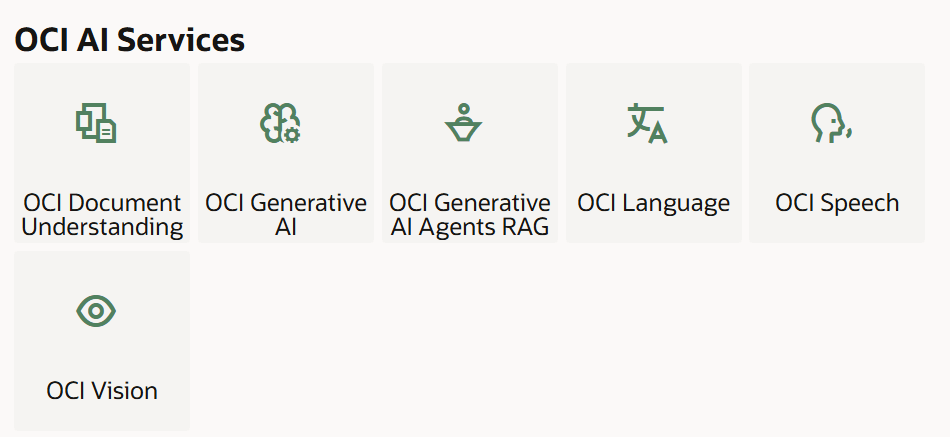- New OCI AI Services native actions (OCI Document Understanding, OCI Generative AI, OCI Generative AI Agents RAG, OCI Language, OCI Speech, OCI Vision)