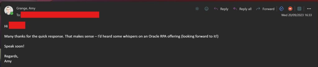 Specifically… “RPA excels where you need to automate tasks in applications without APIs”. As cloud technology evolves and dominates the market, I feel that there is less and less need for RPA solutions (since all cloud solutions come with native API integration capability) and therefore I fell out of love with it. As head of Oracle Technology at Capgemini UK, part of my job is ensuring that our customers get the best and most use out of their technology purchases, and some of that is about encouraging why not to use “sticky plasters” like RPA to replace “proper” integration.