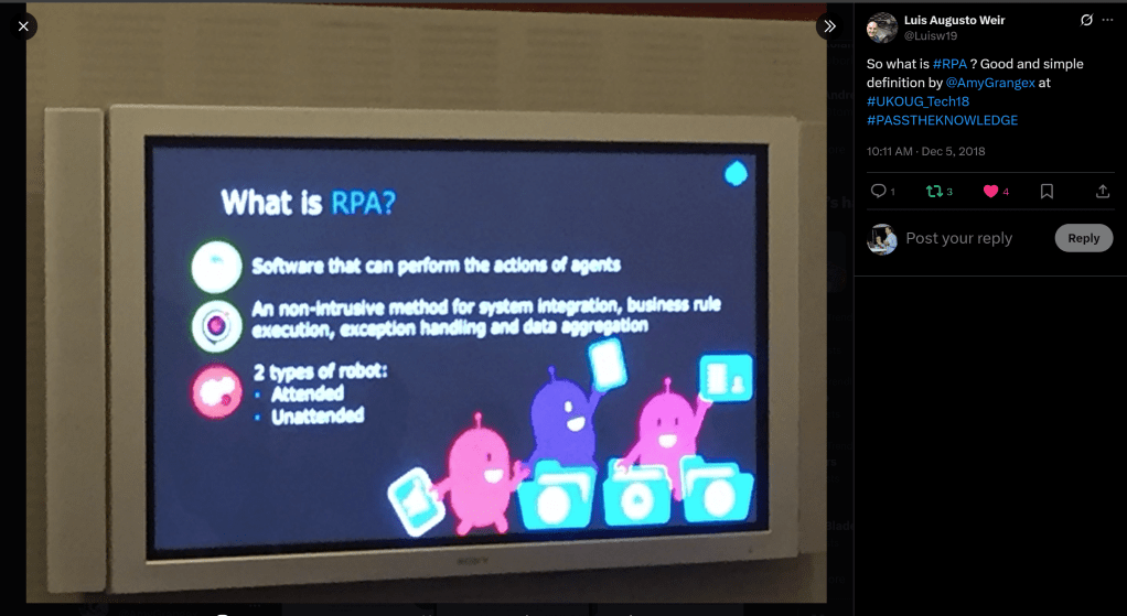 My involvement in the Oracle community and the beginnings of my ACE journey all began with RPA. In 2018, I did my first ever presentation at UKOUG TECH18 on the subject of … you guessed it!… OIC & RPA. There were more posts too if you so wish to go and read about what interested me back in 2018. UiPath – Creating a Robot in Orchestrator, Robotic Process Automation, Pt1 – History & Introduction, Robot Process Automation, Pt2 – What is RPA? … I’m sure there was a Pt3 here too but unfortunately, I can’t locate it 😦